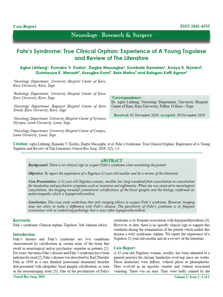 Fahr s Syndrome True Clinical Orphan: Experience of A Young Togolese