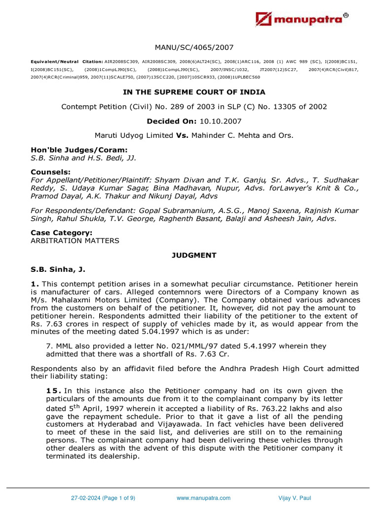 Maruti Udyog Limited Vs Mahinder C Mehta and Ors 1S071092COM333394