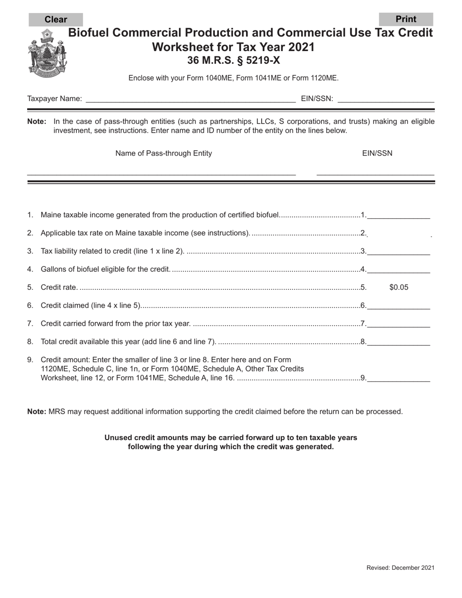 2021 Maine Biofuel Commercial Production and Commercial Use Tax Credit