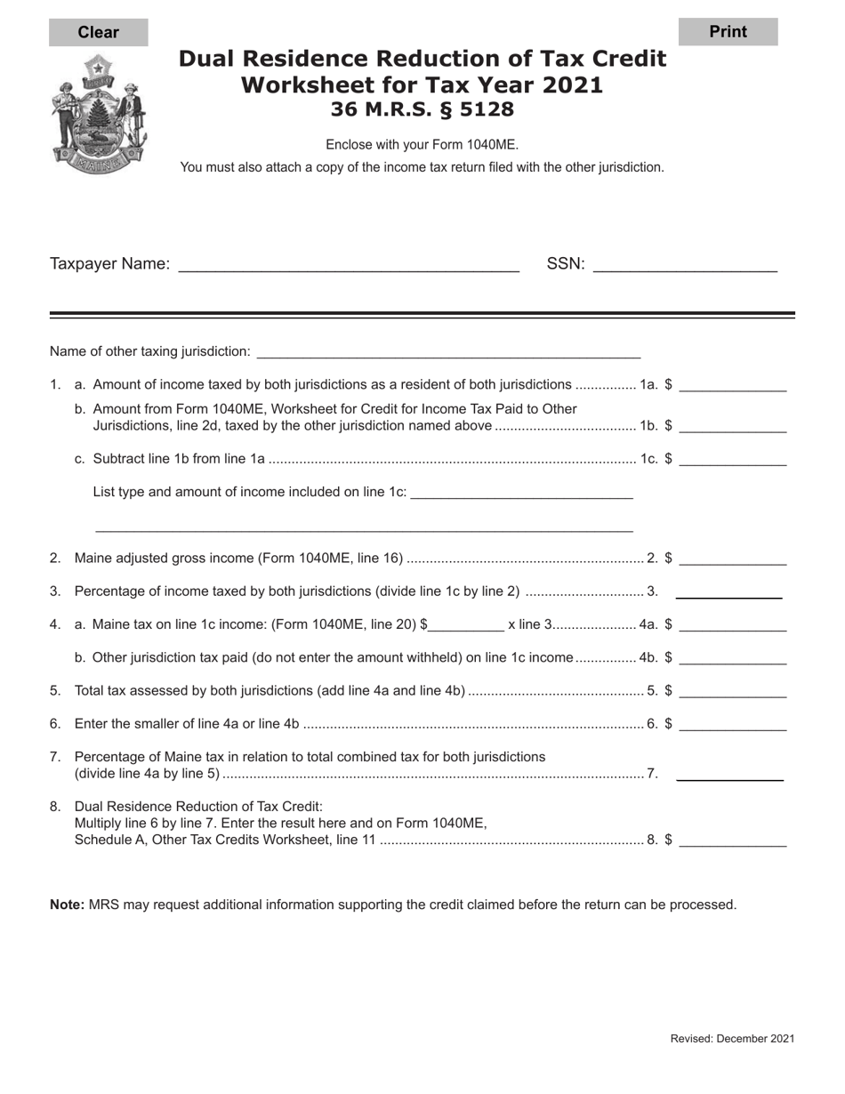2021 Maine Dual Residence Reduction of Tax Credit Worksheet Fill Out