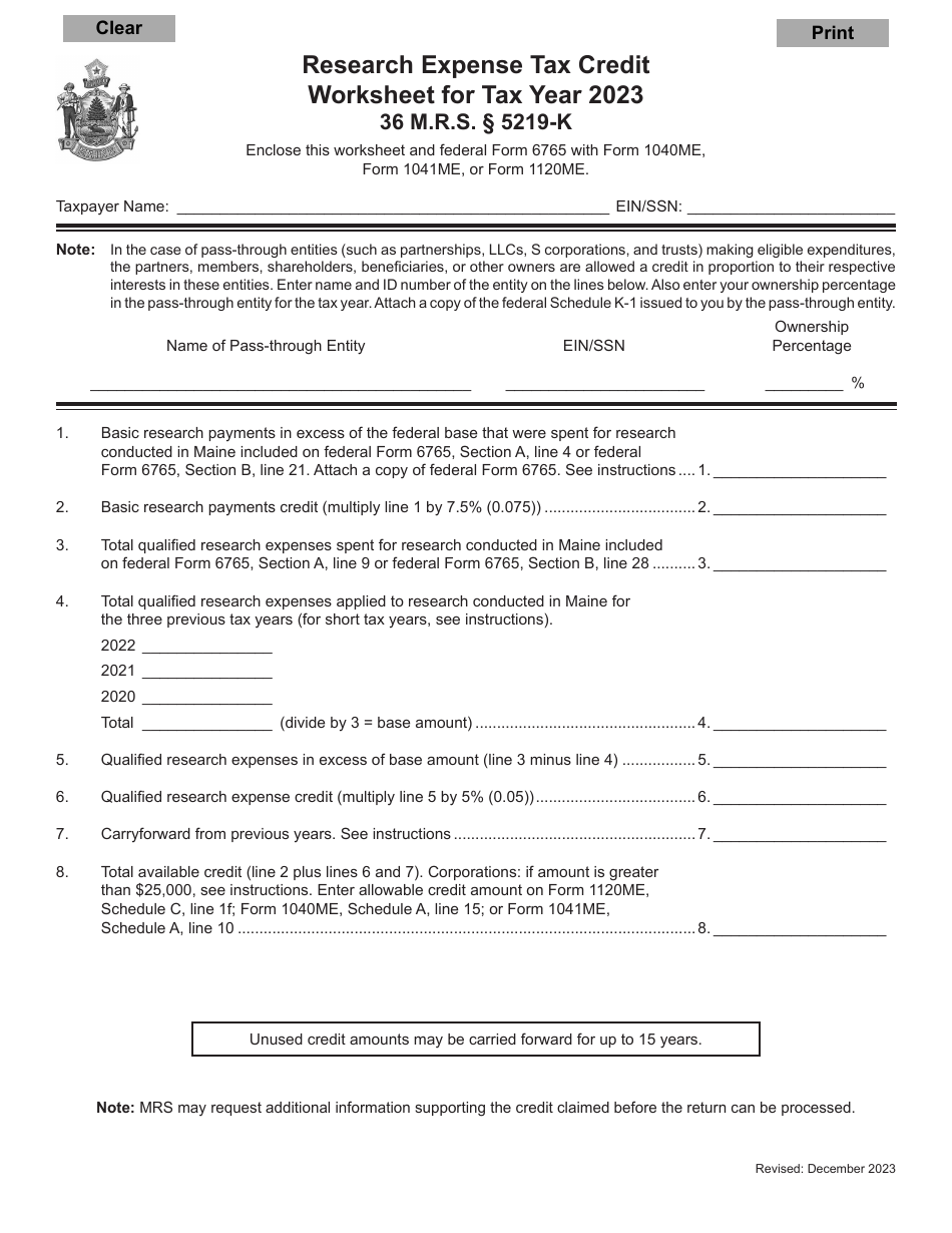 2023 Maine Research Expense Tax Credit Worksheet Download Fillable PDF