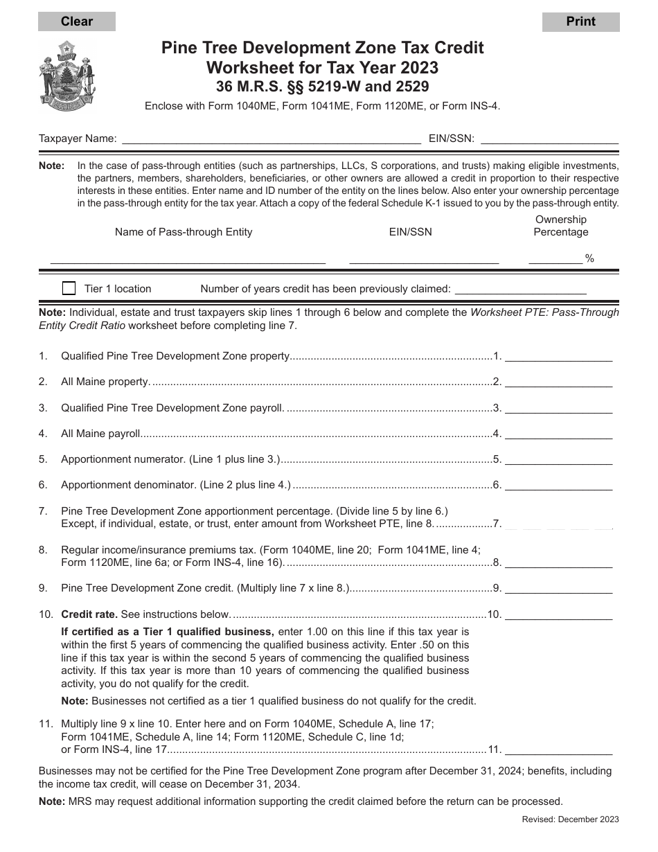 2023 Maine Pine Tree Development Zone Tax Credit Worksheet Download