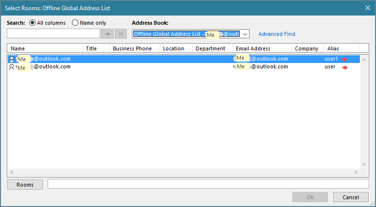 Outlook Calendar Location Offline Global Address list showing 2 users