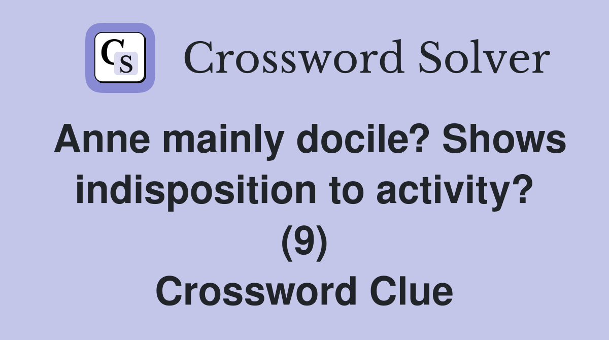 Anne mainly docile? Shows indisposition to activity? (9) Crossword