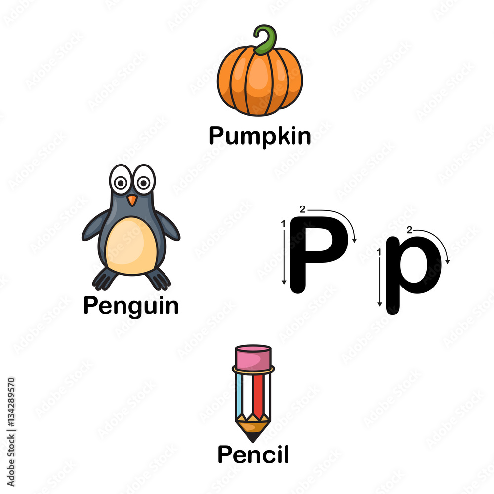 Alphabet Letter P pumpkin penguin pencil illustration Stock Vector