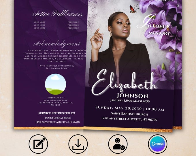 Purple Floral 8 Page Funeral Program Template Editable 8 5x11 8 5x5 5
