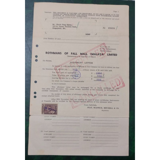 Malaya 1962 Rothmans of Pall Mall Limited Allotment Letter for Share
