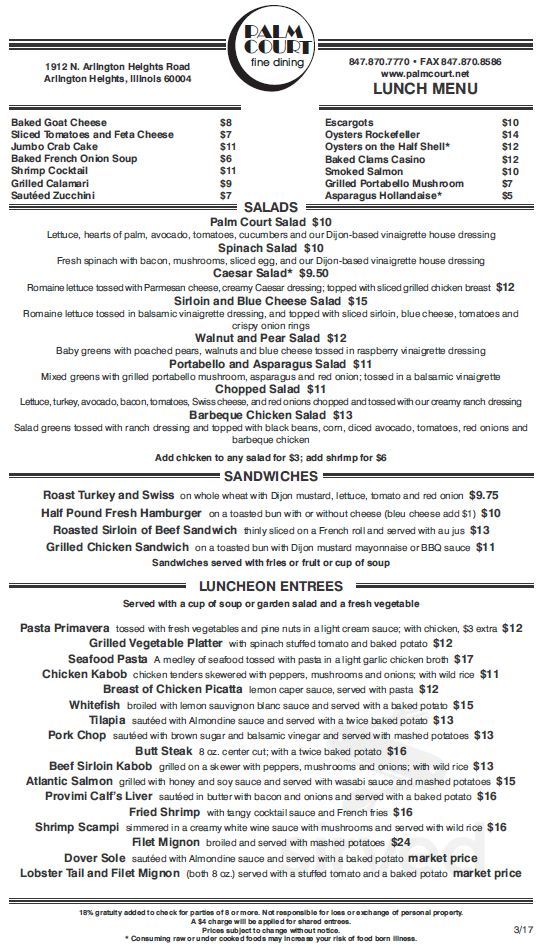 Palm Court Restaurant menu in Arlington Heights Illinois USA