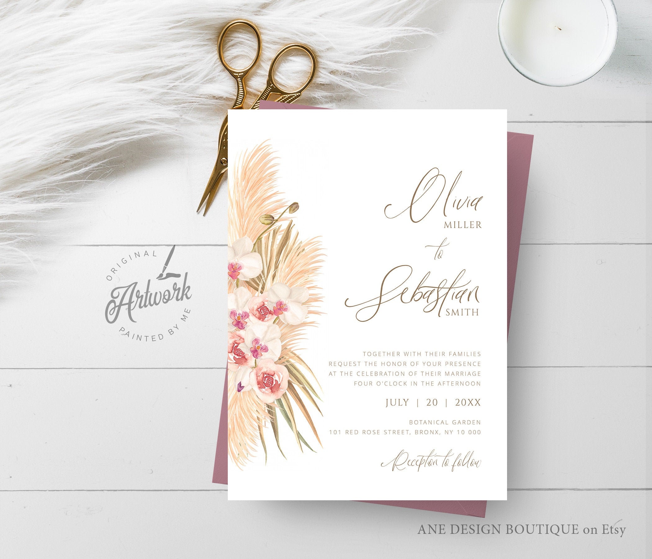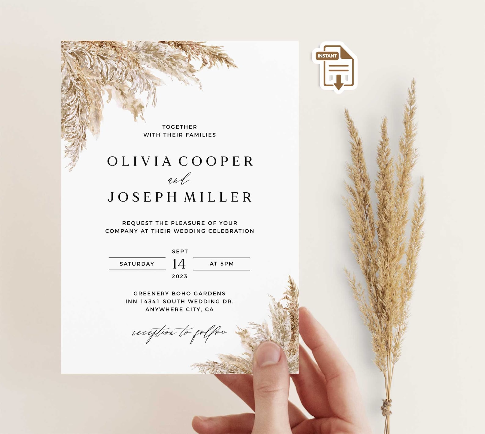 Modern Pampas Grass Wedding Invitation Template Printable Boho Wedding