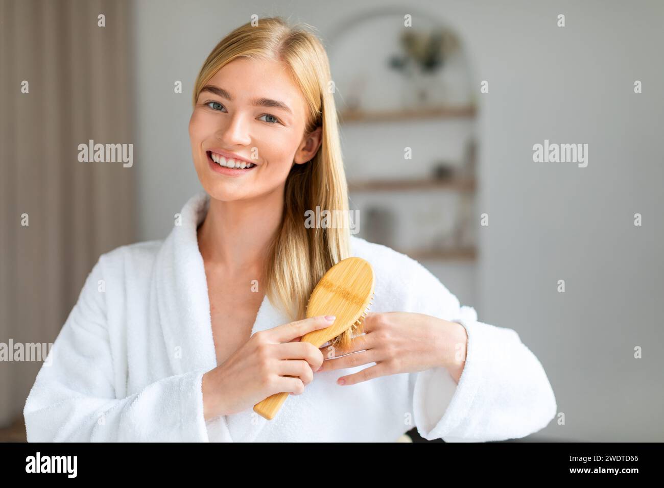 Blonde lady enjoying self pampering brushing long straight hair indoors
