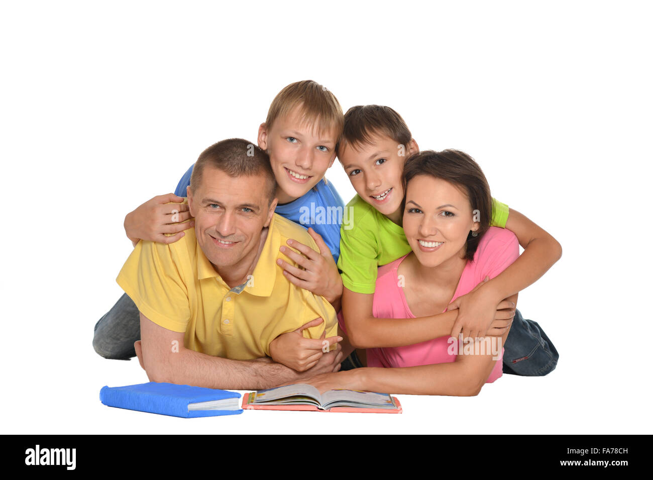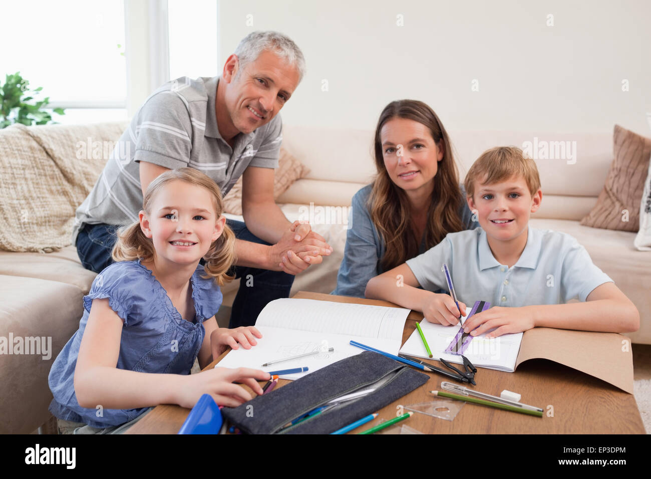 Happy parents helping her children to do their homework Stock Photo Alamy