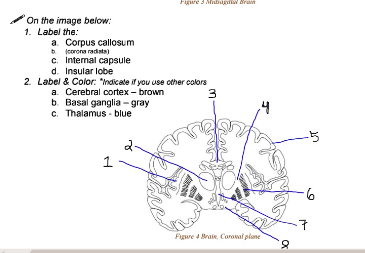 On the image below: 1 Label the: a Corpus callosum b (corona radiata