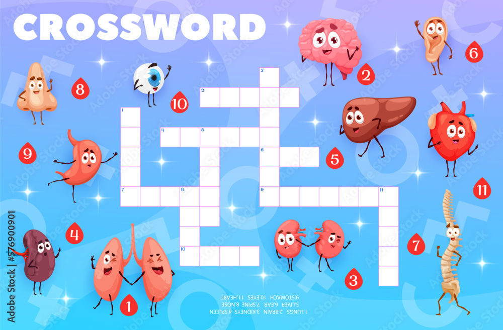 Crossword quiz game grid Cartoon human organ characters Funny vector