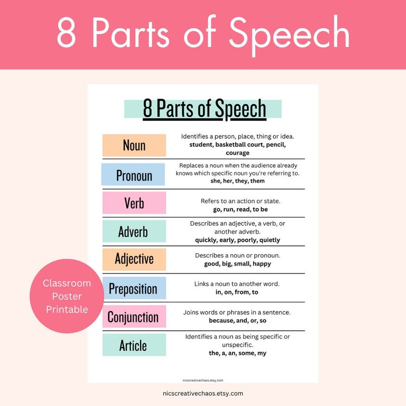 English Grammar Parts of Speech Poster Classroom Grammar Poster