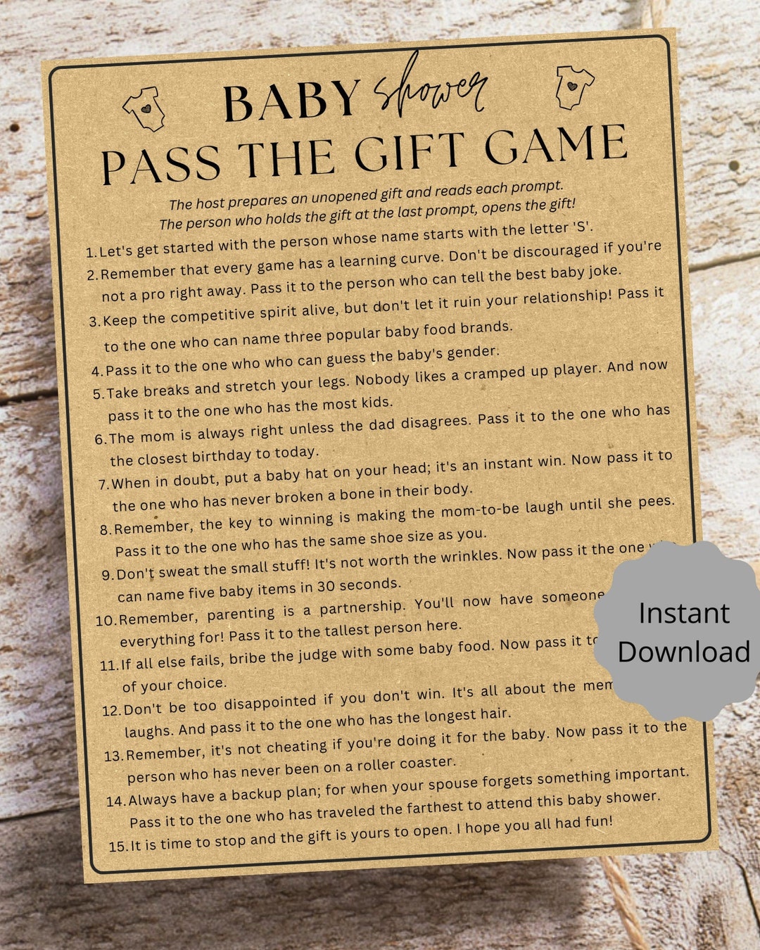 Baby Shower Pass the Gift Game Printable Game Kraft Rustic Baby Shower