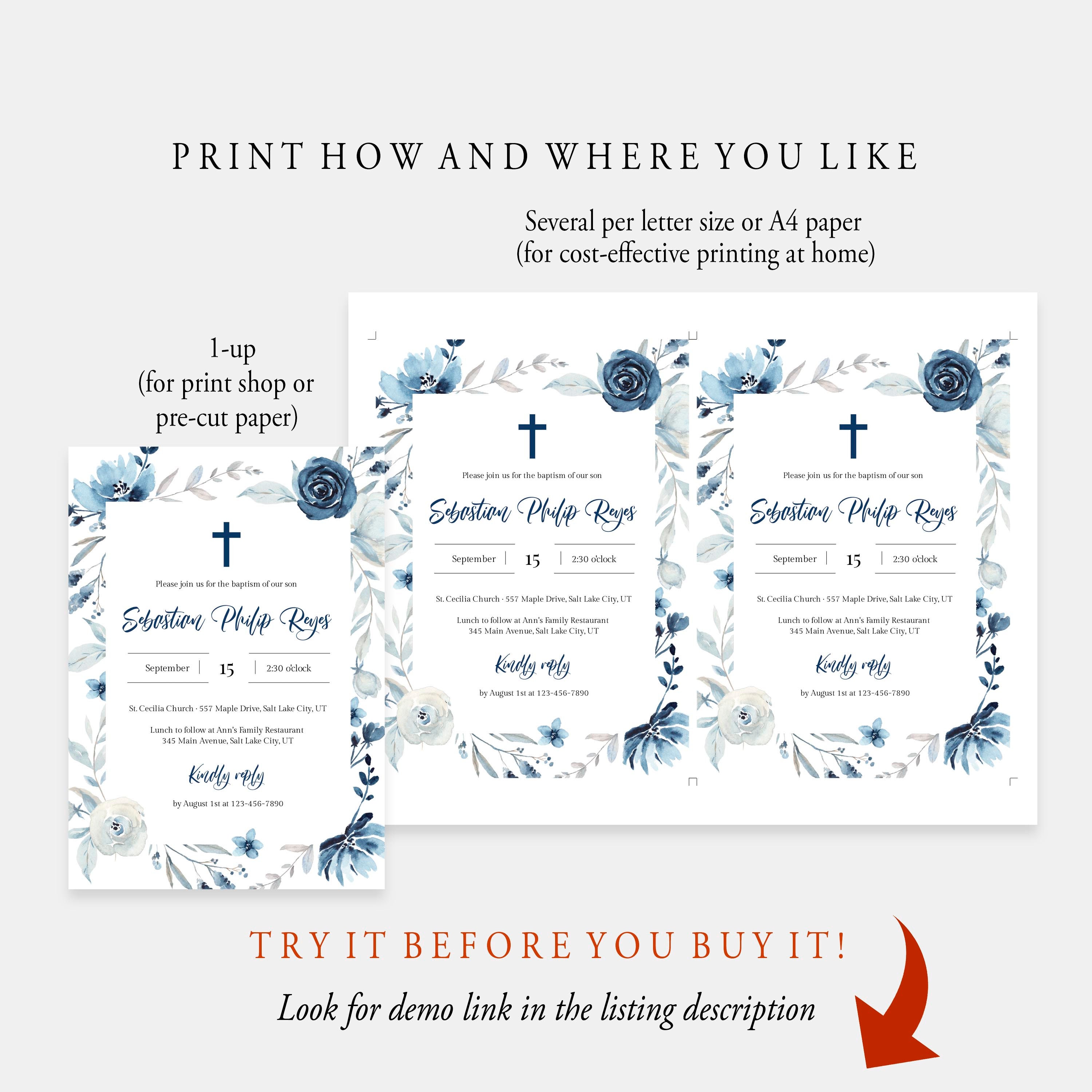 Boy Baptism Invitation Template Editable Blue and Silver Etsy