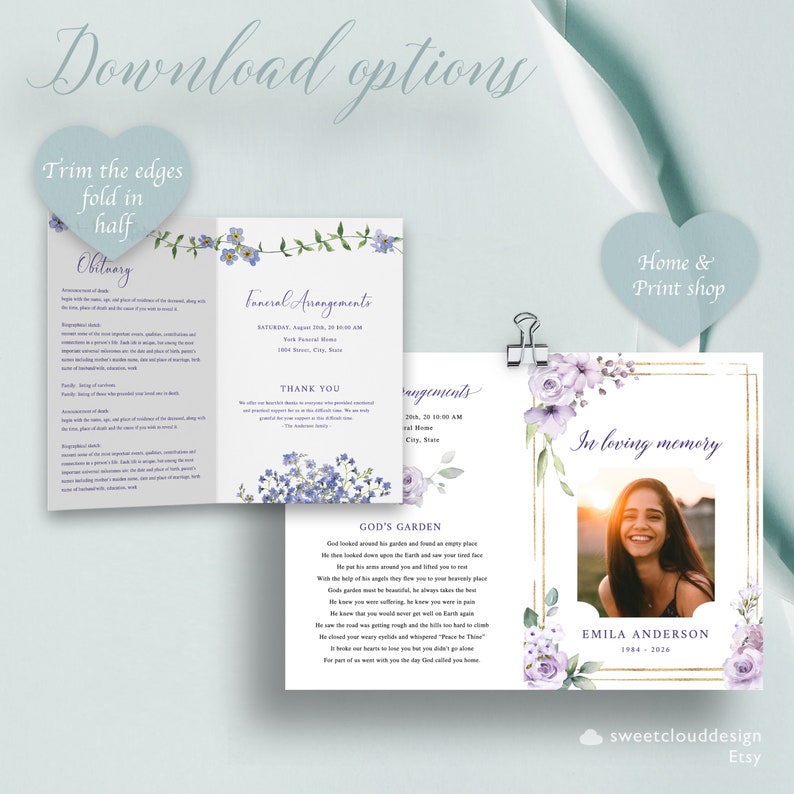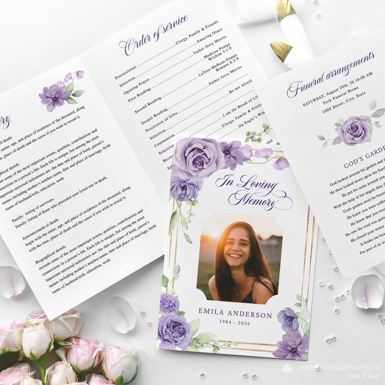 Violet Funeral Program Template Purple Floral Funeral Memorial Etsy