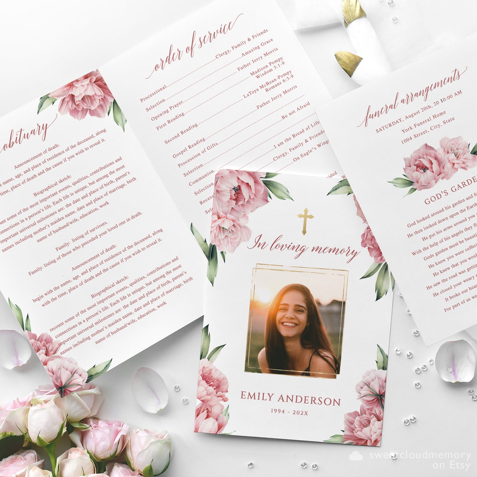 Pink PEONY Funeral Program Template Gold Cross Funeral Memorial Program