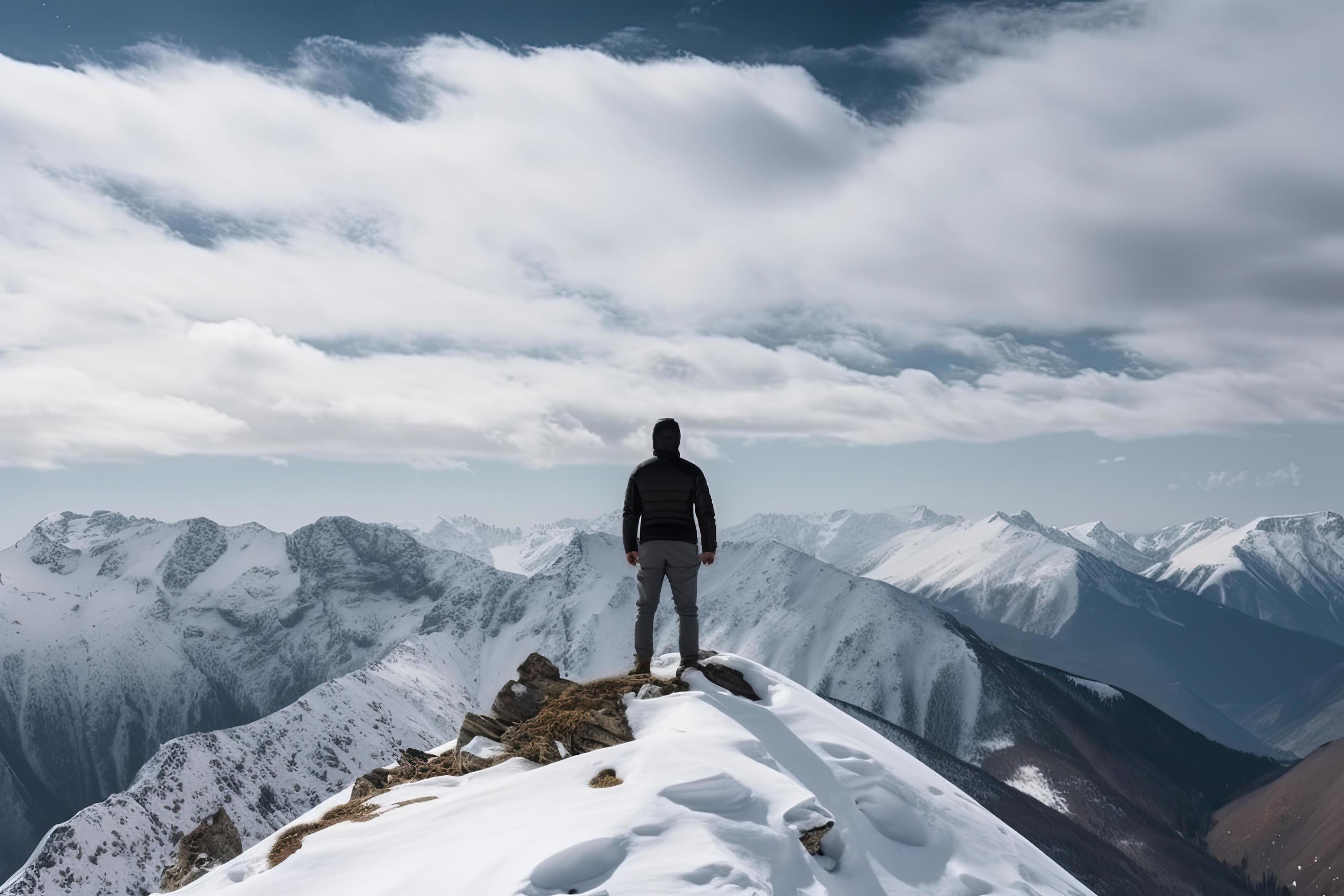 Man standing on the top of a snowcapped mountain peak Panoramic view