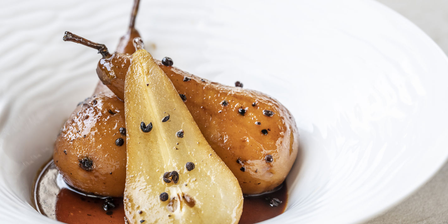 Poached Pears with Sichuan Pepper and Cardamom Recipe Great British Chefs