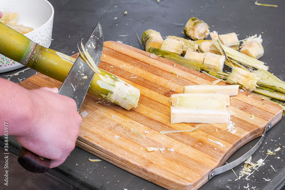 Peeling the bud of a stem of sugar cane Cutting the sugarcane with a
