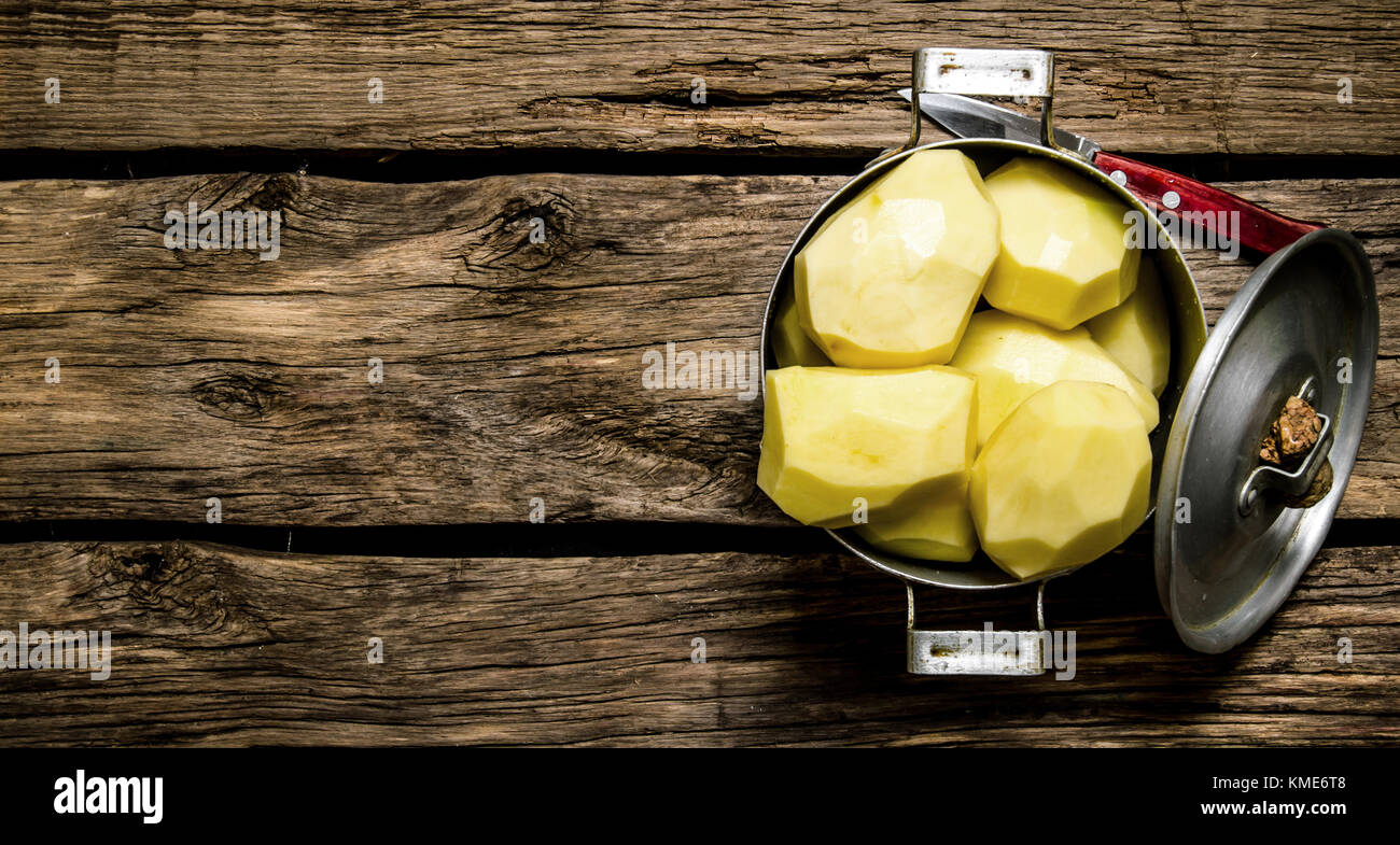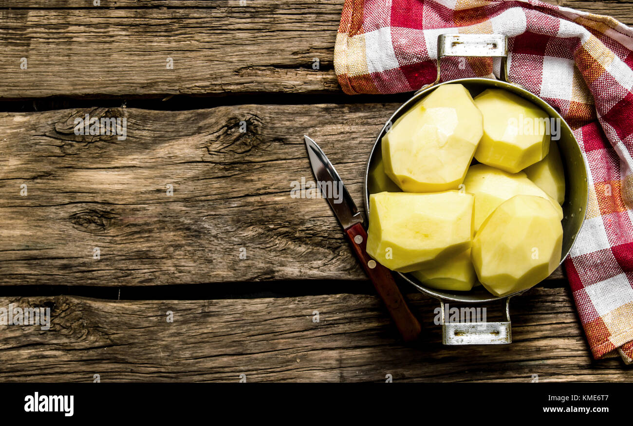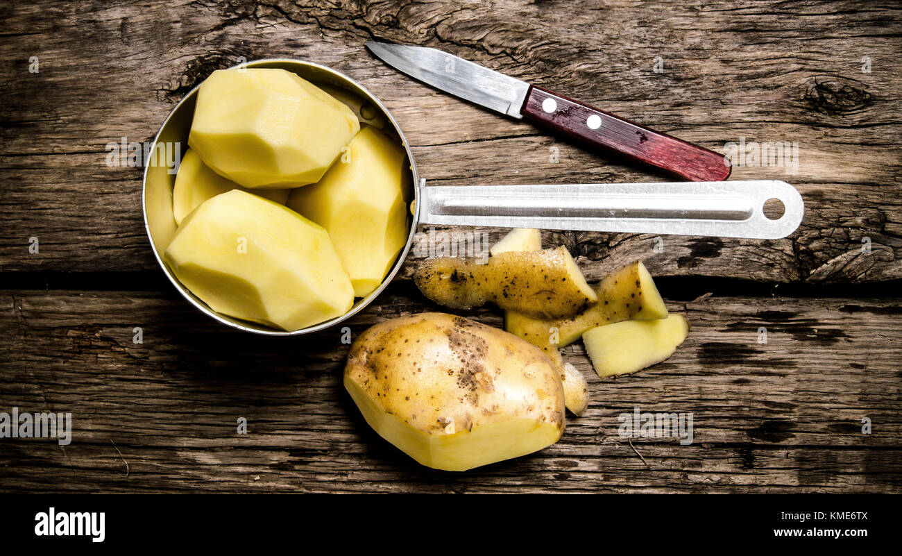 Potato food Peeled potatoes in an old pan with knife on wooden table