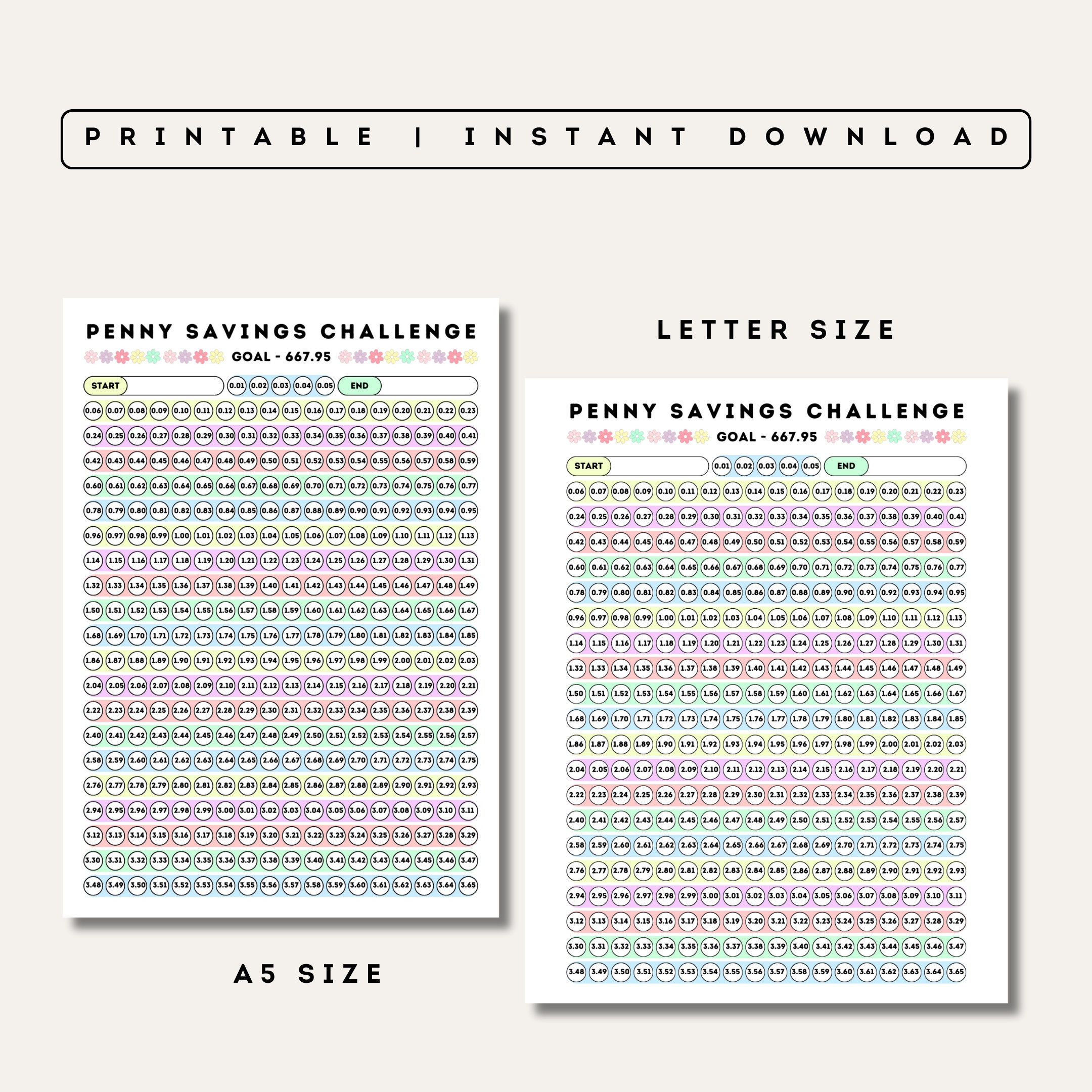 4 Page Floral Penny Challenge Savings Tracker Save $667 95