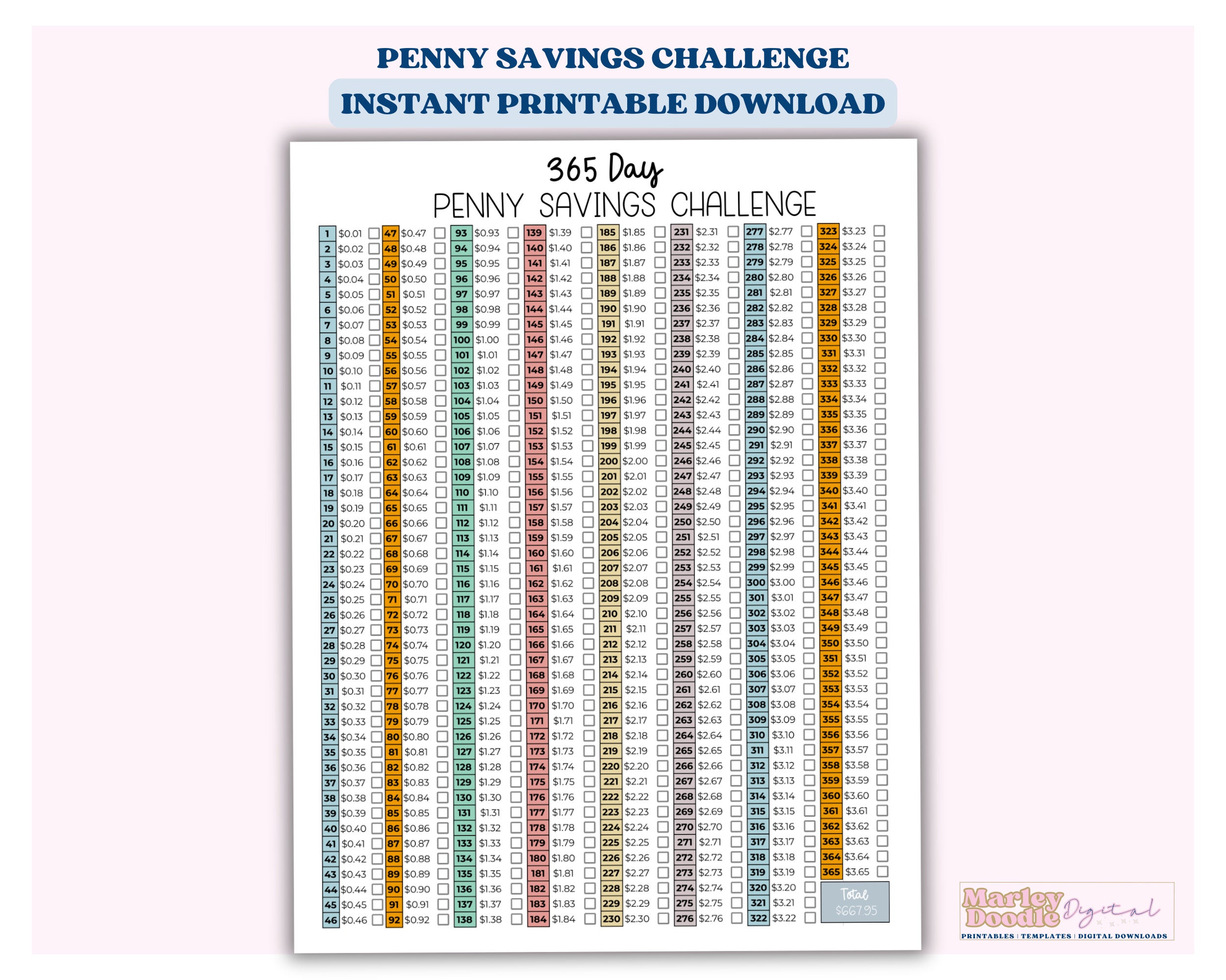 Penny Savings Challenge Printable 365 Day Money Goals Challenge 1c