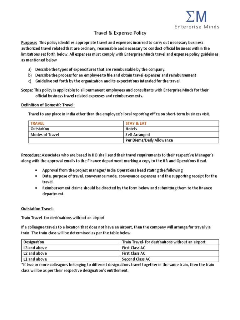 Travel Expense Policy PDF Per Diem Expense
