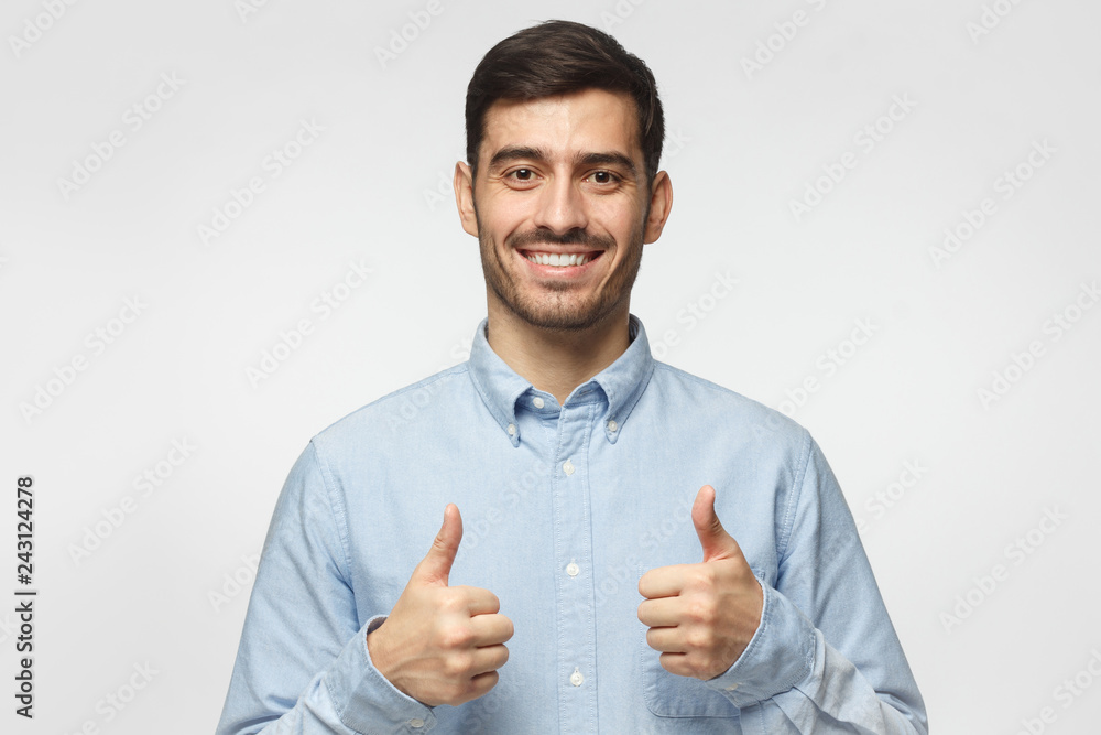 Photo of Funny Confident Guy Dressed Grey T shirt Smiling Showing Thumb