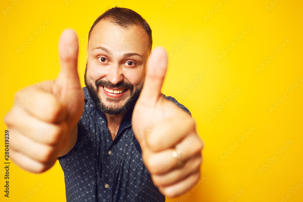 Thumbs UP concept Close up portrait of charismatic 35 years old man