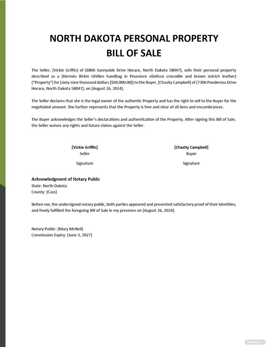 North Dakota Personal Property Bill Of Sale Template Google Docs