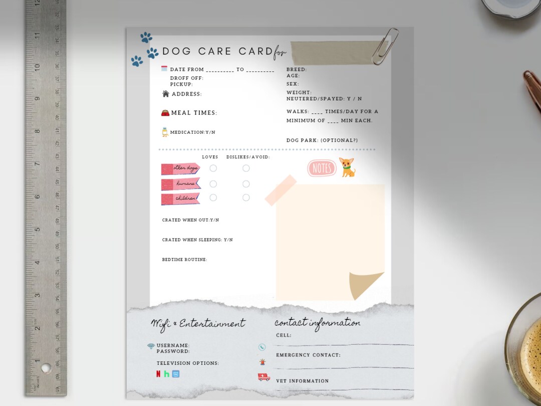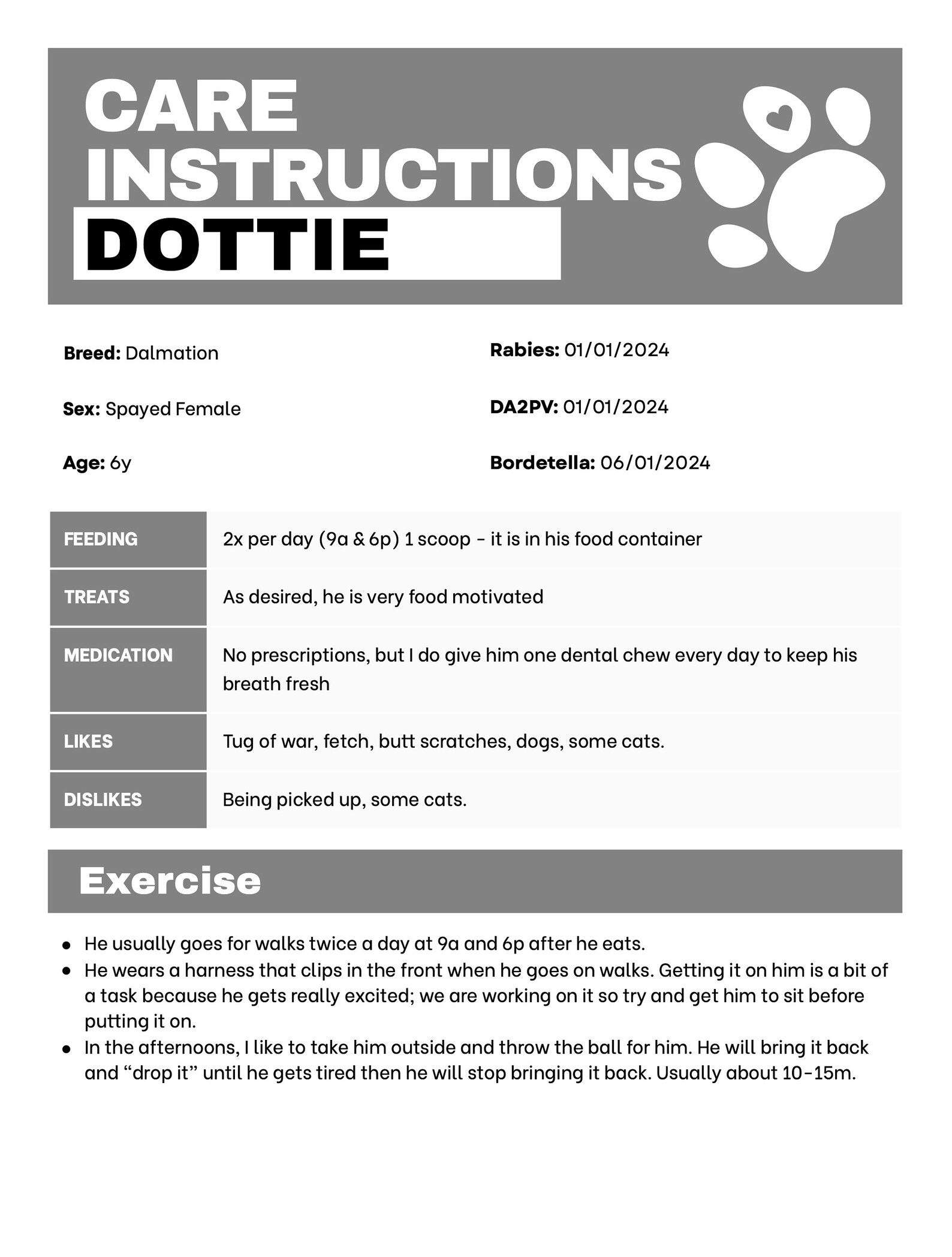 Dog Pet Care Instructions Digital Printable for Dog Owners and Sitters