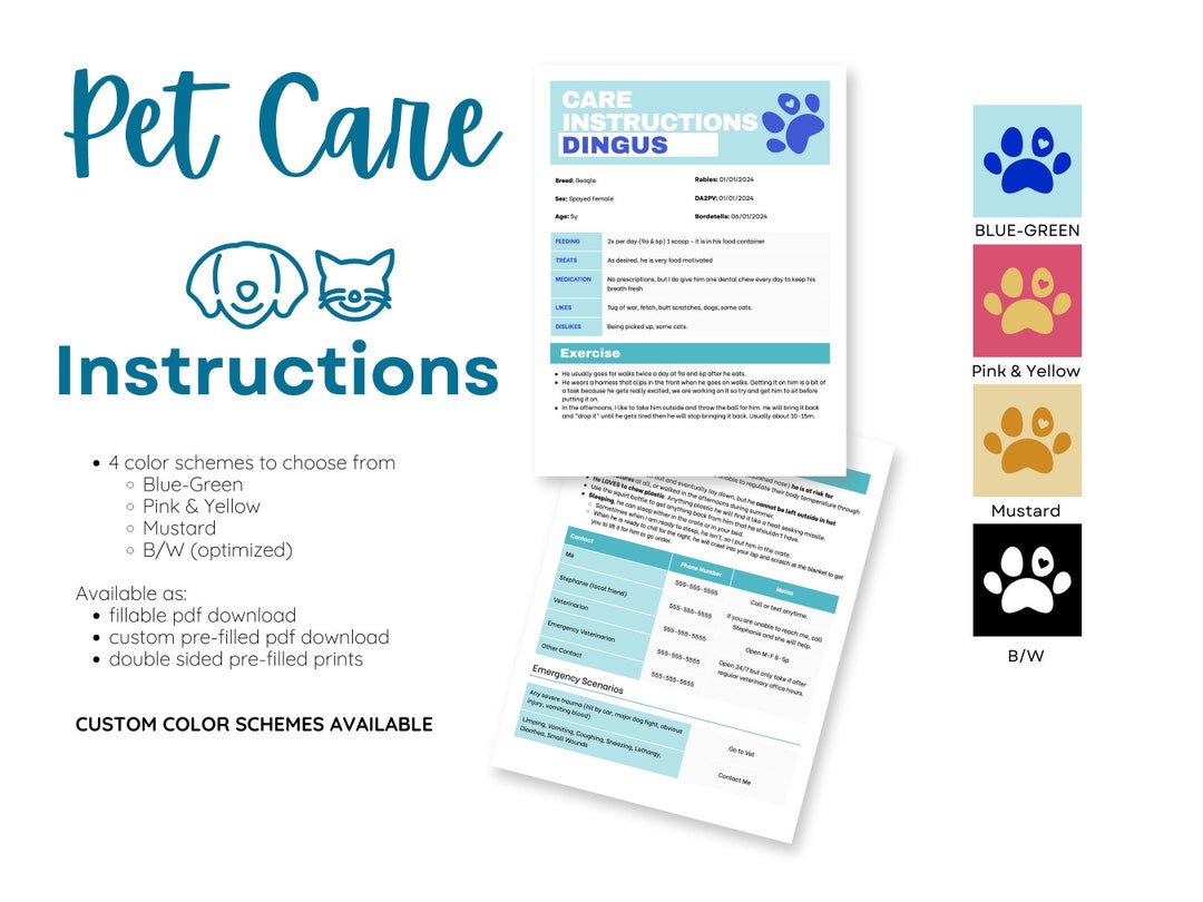 Printable Pet Care Information Sheet Pet Care Instructions Etsy
