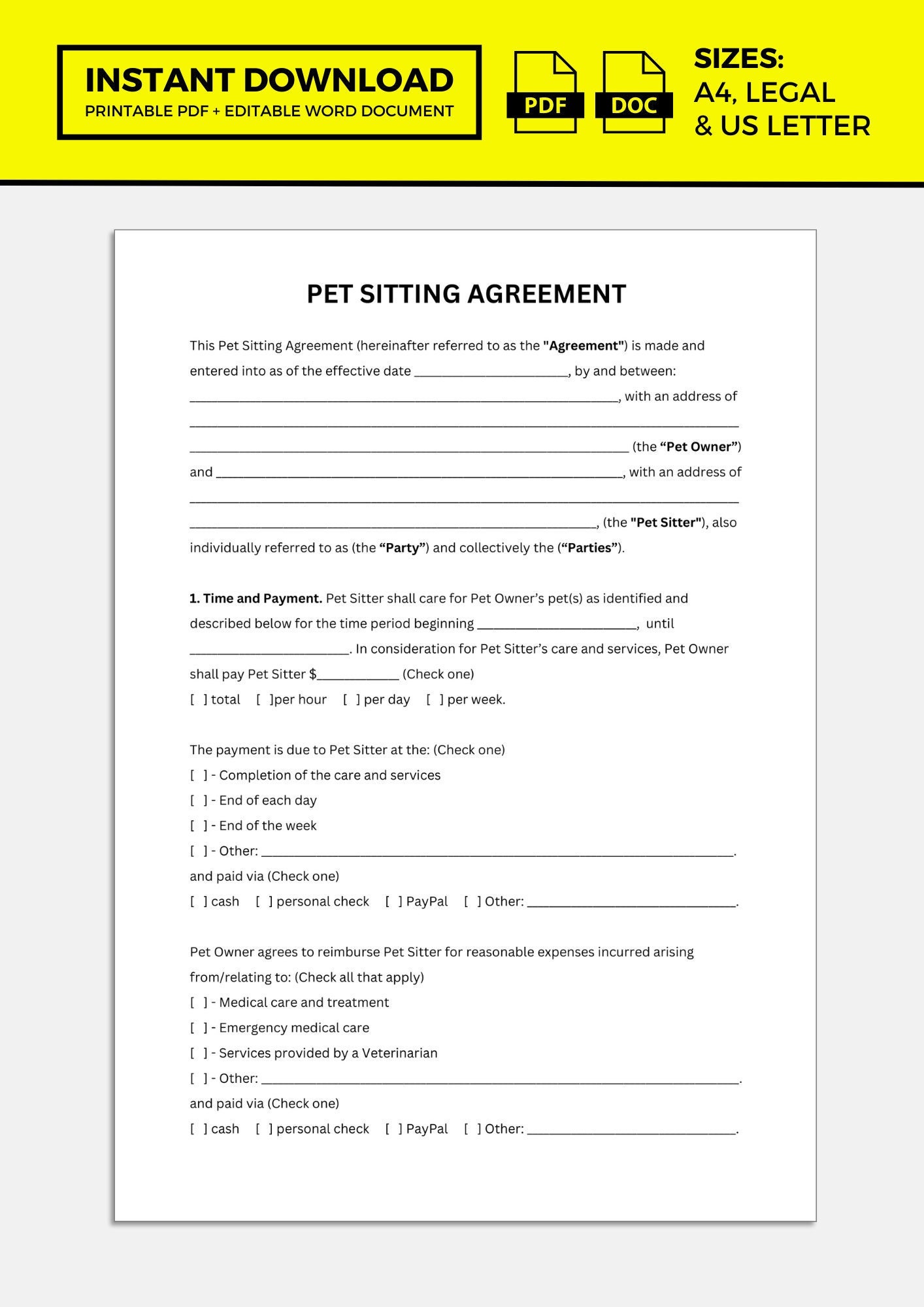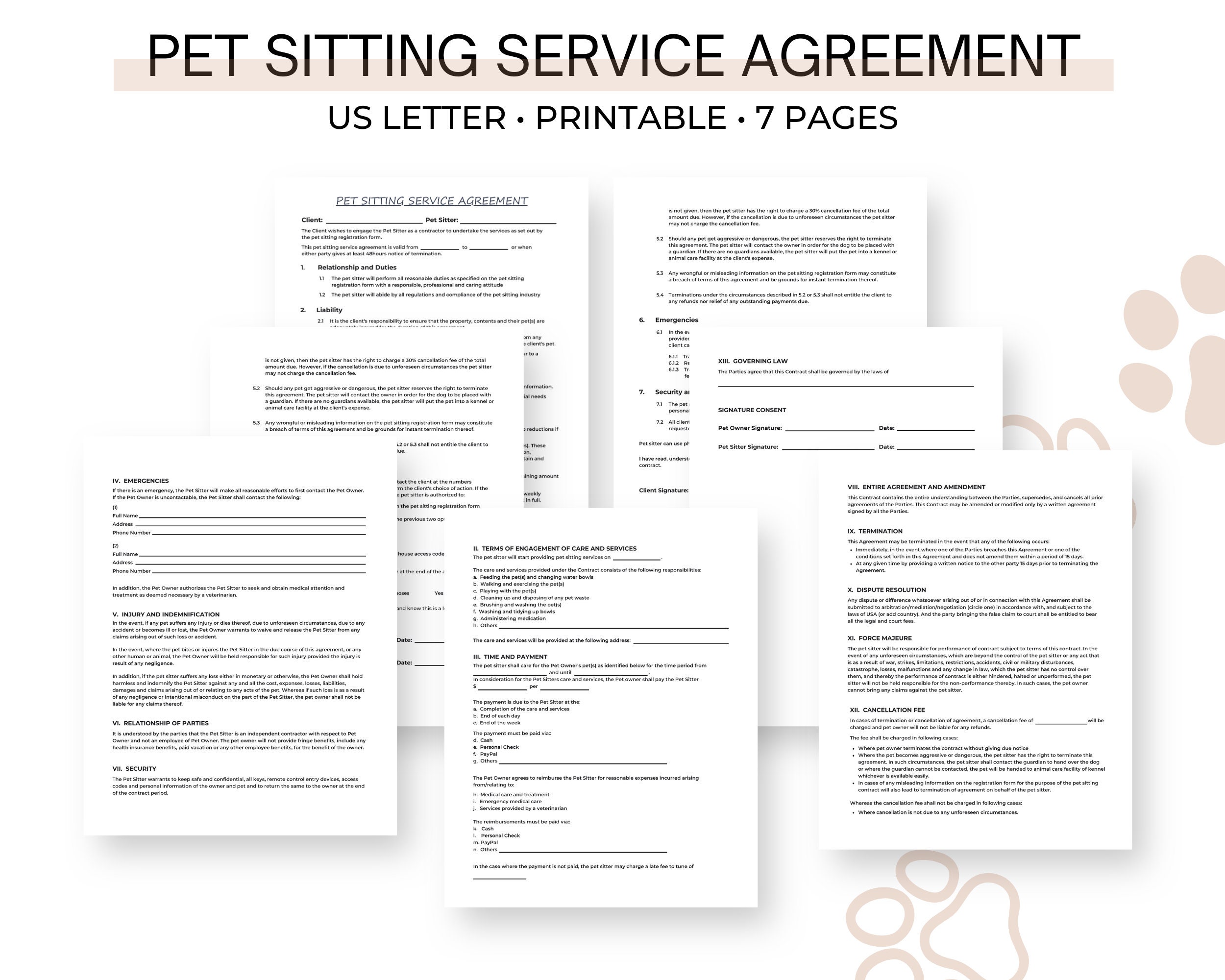 Pet Sitting Service Agreement Template 7 Page DIY Editable Pet Sitter