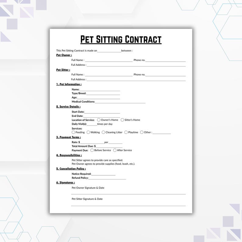 Editable Pet Sitting Contract Template Single Page Dog Sitting Form