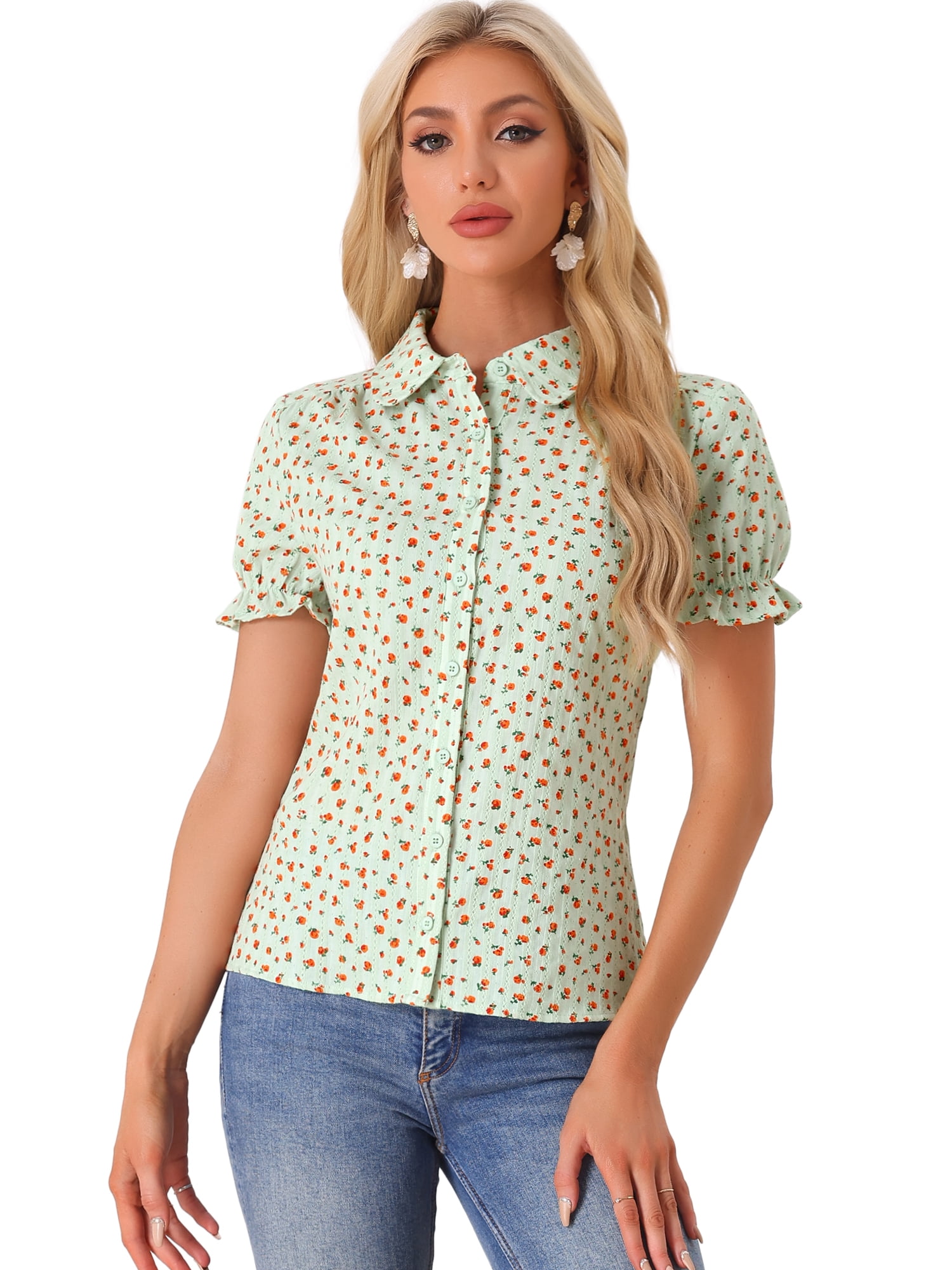 DARING DIVA Floral Peter Pan Collar Short Sleeve Blouse XS Light Green