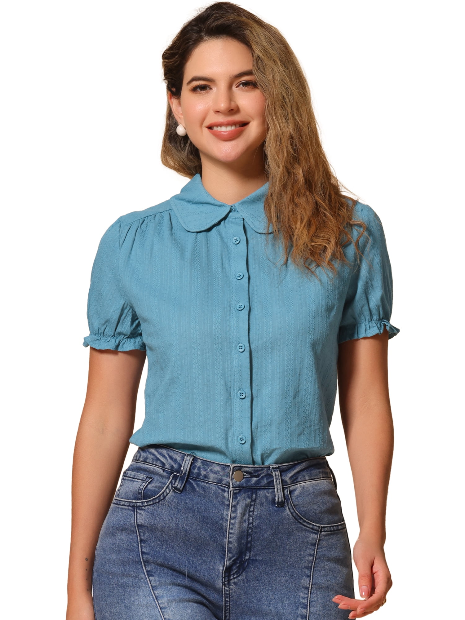 DARING DIVA Women #39 s Peter Pan Collar Puff Sleeve Work Blouse XS Blue