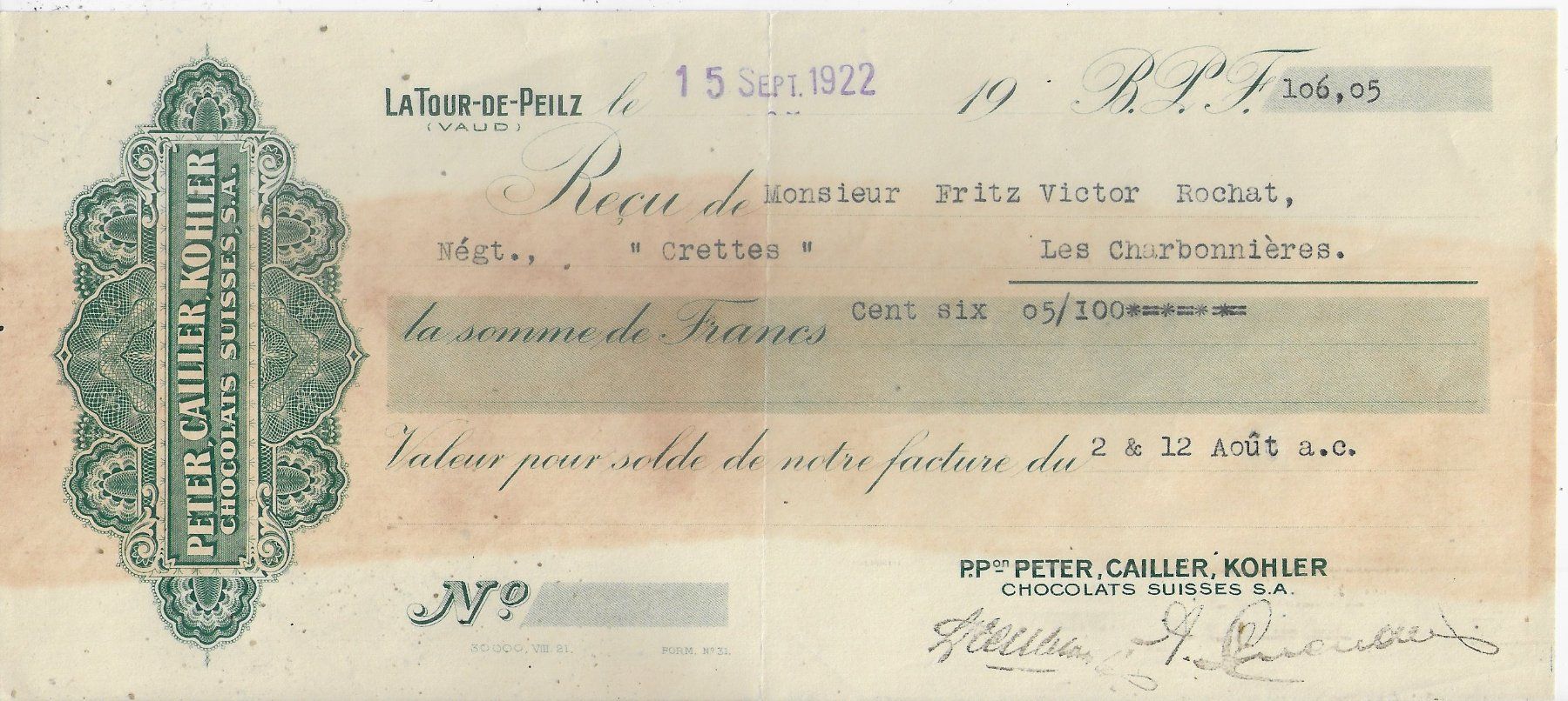 Recu Peter Cailler Kohler Chocolats La Tour de Peilz 1922 (Gebraucht