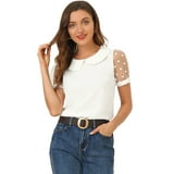 DARING DIVA Women #39 s Polka Dots Mesh Peter Pan Collar Blouse L White