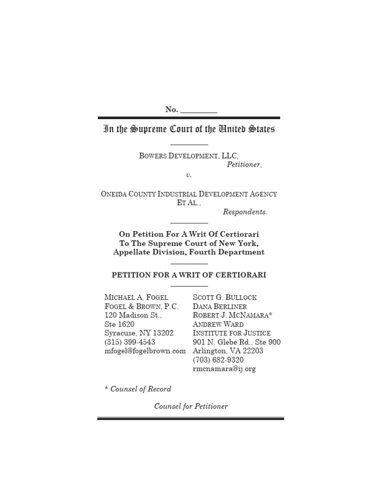 Petition for a Writ of Certiorari Bowers Dev LLC v Oneida Cnty
