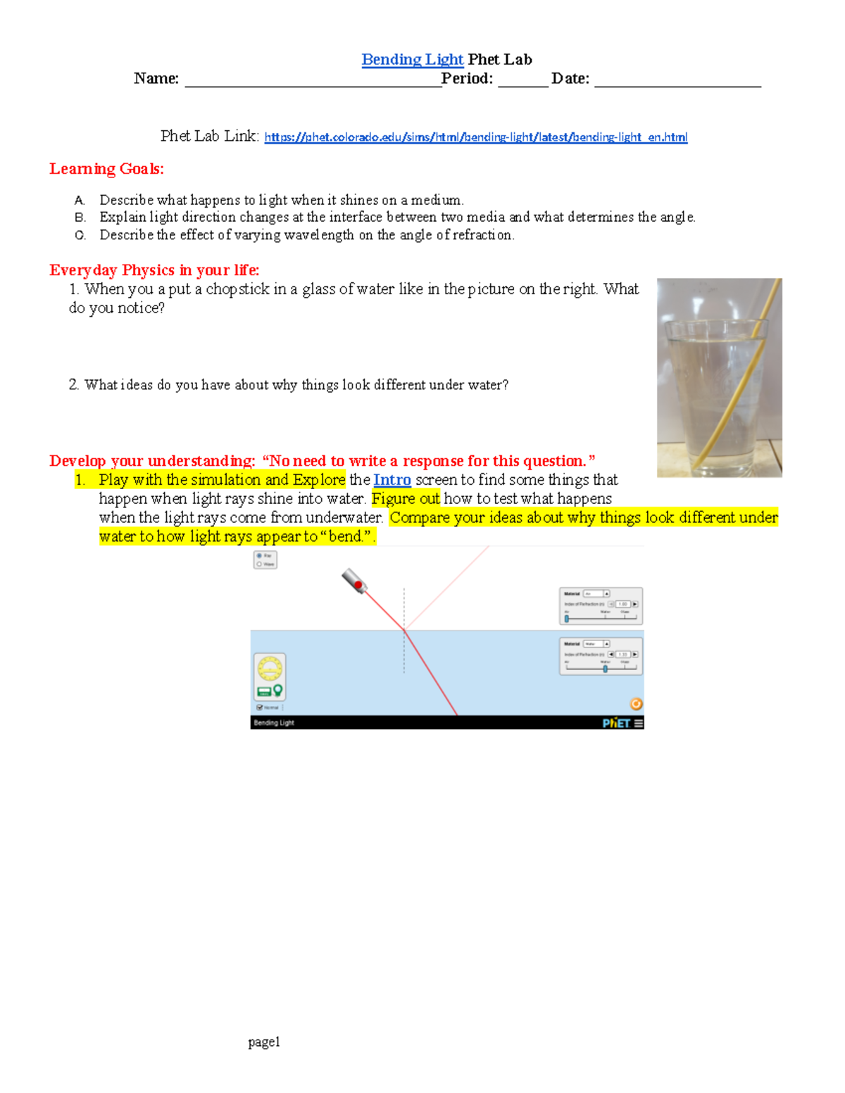 Kami Export Unit 5 Phet lab Bending Light Student worksheet page 1