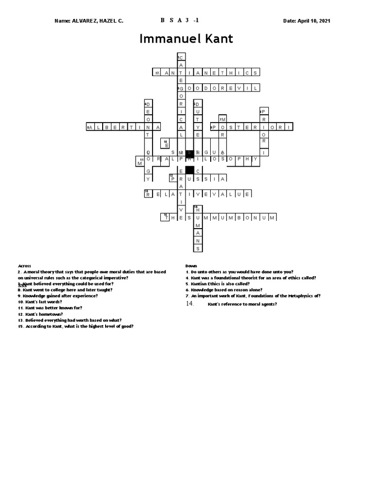 Immanuel Kant Crossword Puzzle Week 13 PDF Immanuel Kant