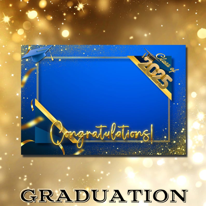 Blue Graduation Photo Booth Template 2025 With Falling Gold Ribbon