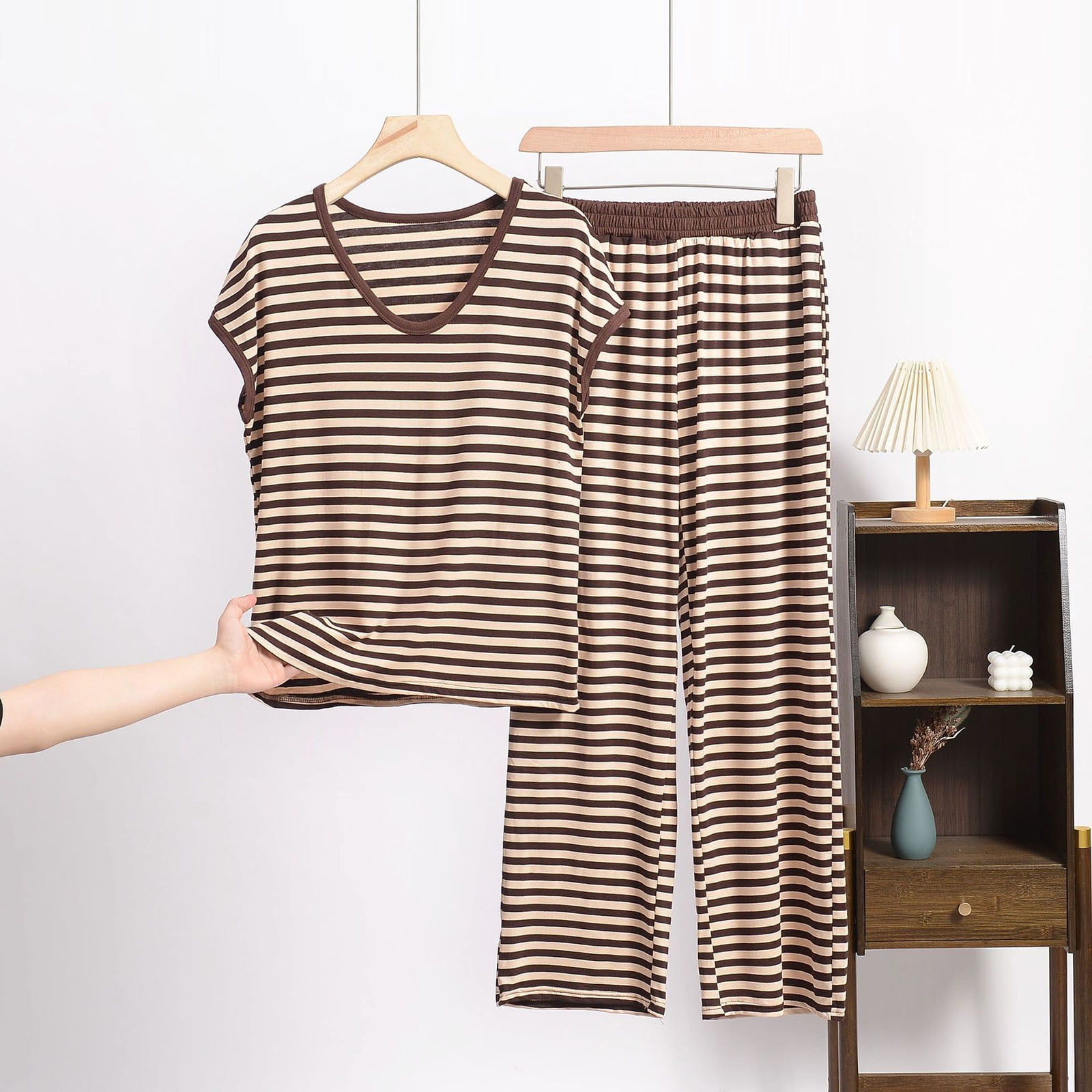Delliss Women #39 s 2 Piece Set Strip Print V Neck T Shirt And Baggy Pants