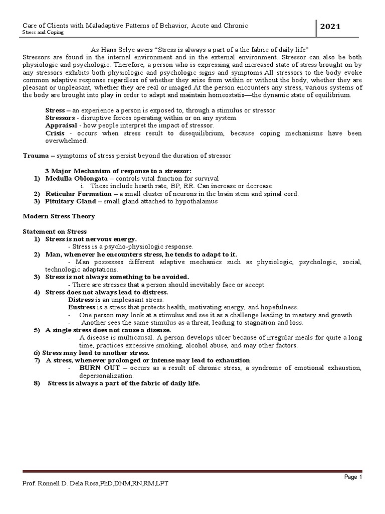 Stress and Coping: Prof Ronnell D Dela Rosa PHD DNM RN RM LPT