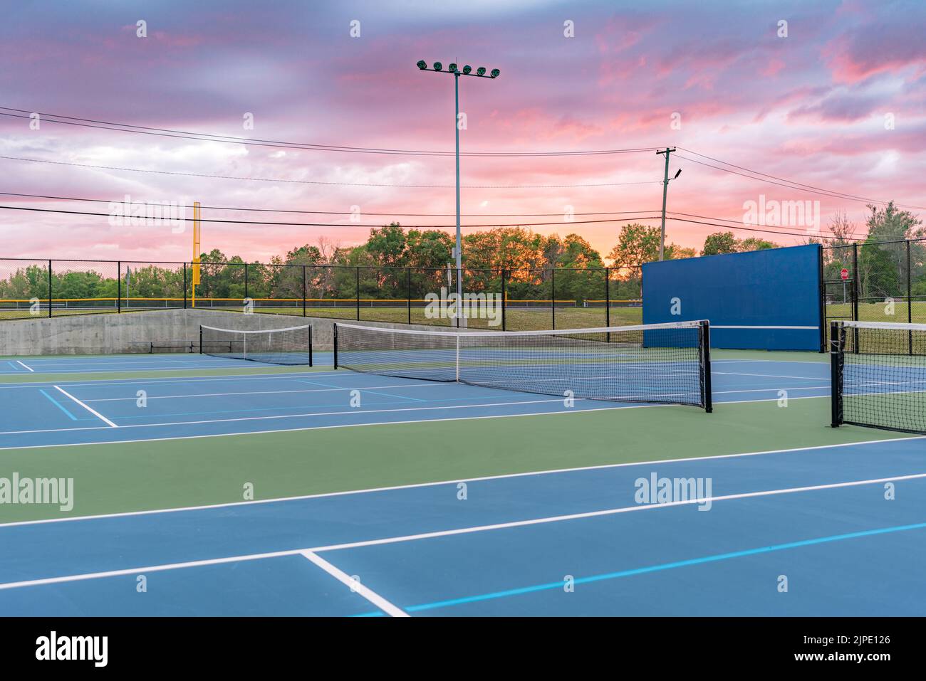 New red outdoor tennis courts with combined gray pickleball lines Stock