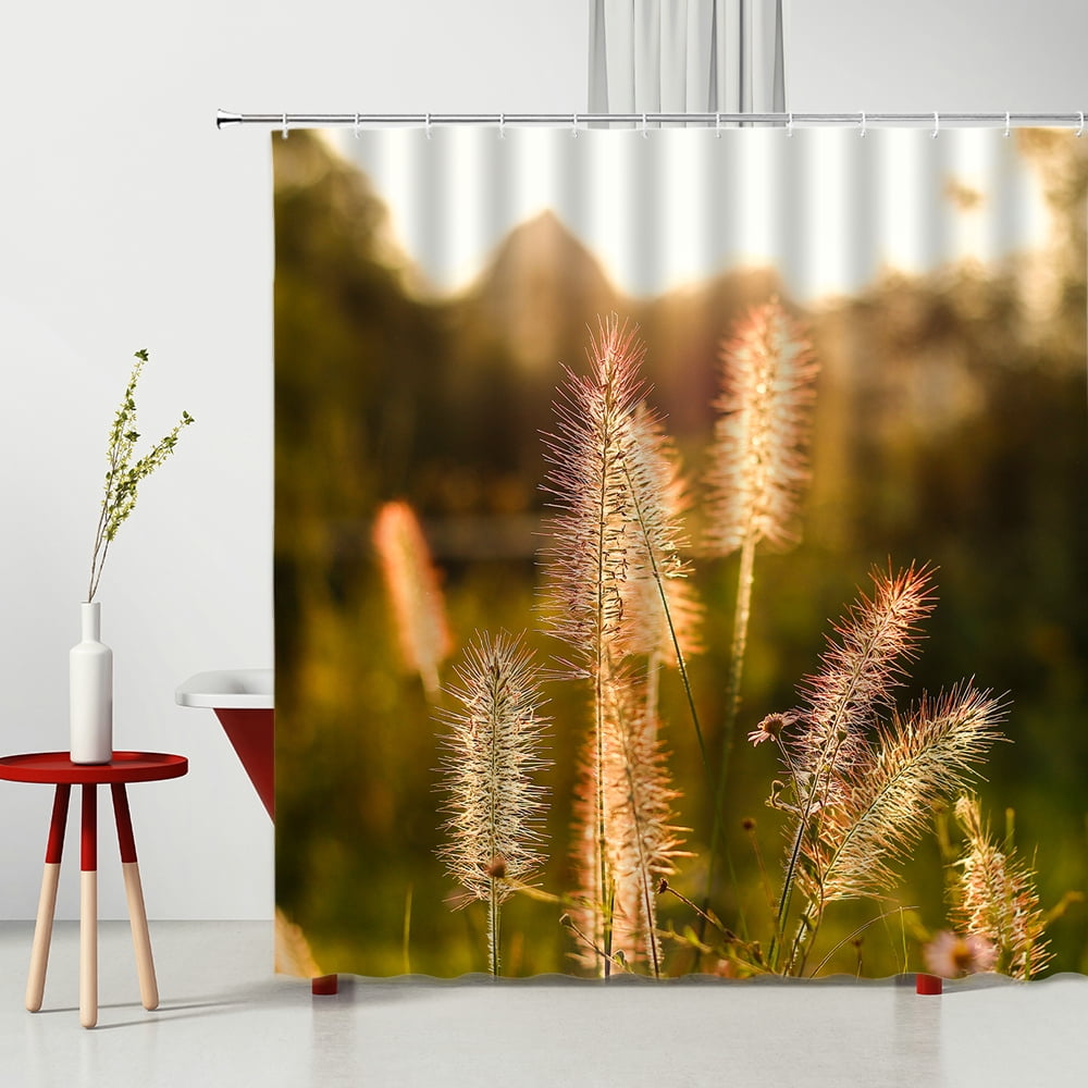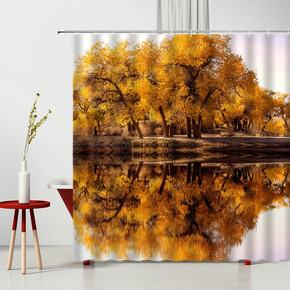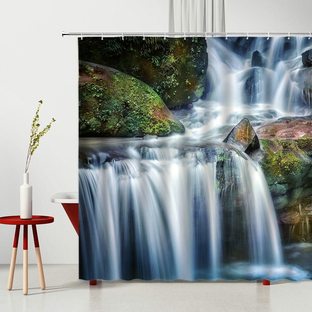 3D Waterfall Shower Curtain Natural Scenery Tree Bridge Wooden Pile