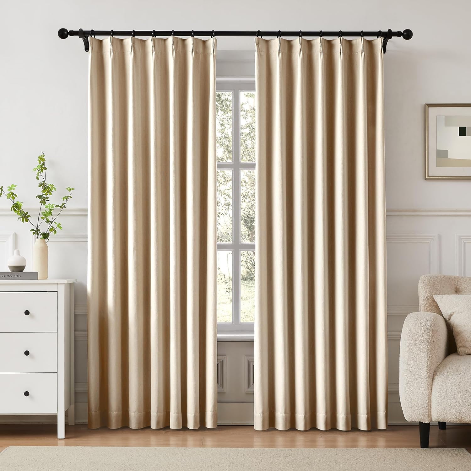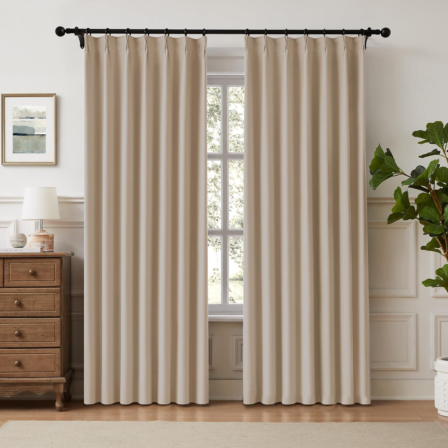 Beige Blackout Pinch Pleated Curtains for Bedroom 63 Inch Length Linen