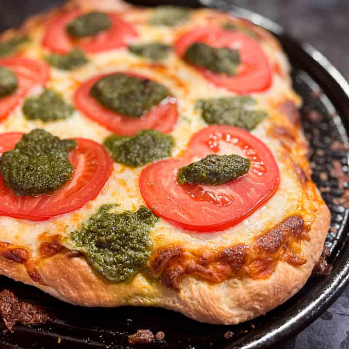 Pesto Pizza with Fresh Mozzarella and Tomatoes Babaganosh
